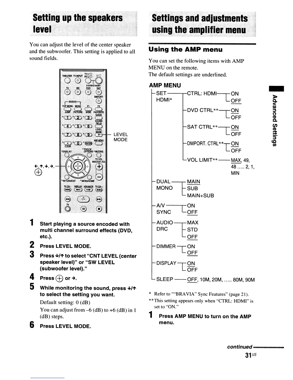 Sony HT-CT100 - Speaker Level and Amplifier Menu Configuration; Adjusting Speaker Levels and Menu Settings