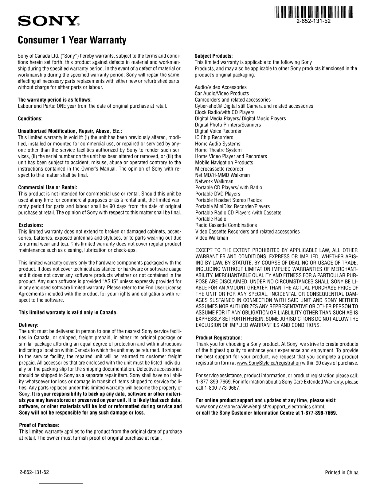 Sony HT-CT100 - Limited Warranty (U.S. Only); U.S. Warranty Terms and Conditions