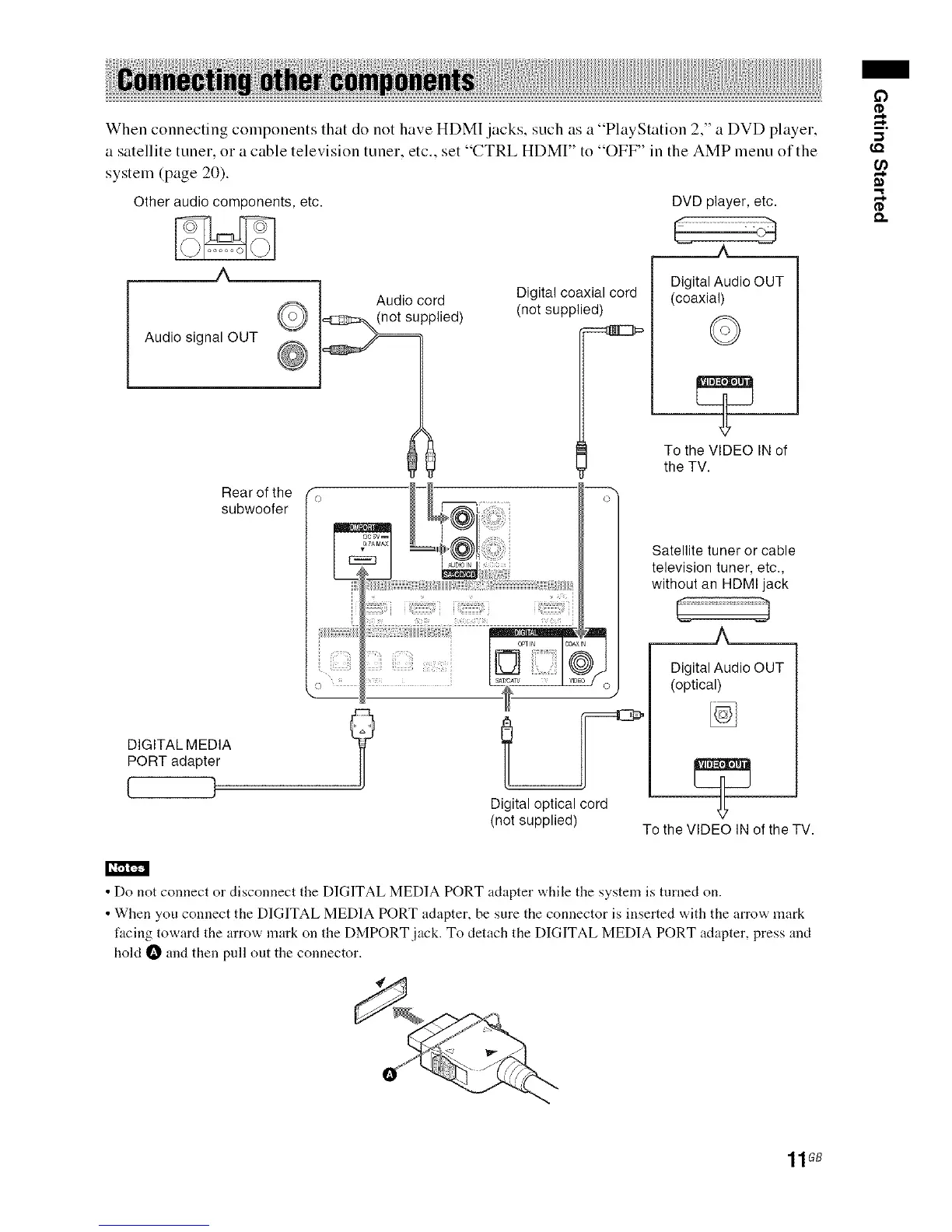 • Do not connect or disconnect the DIGITAL MEDIA PORT adapter while the system is turned on.