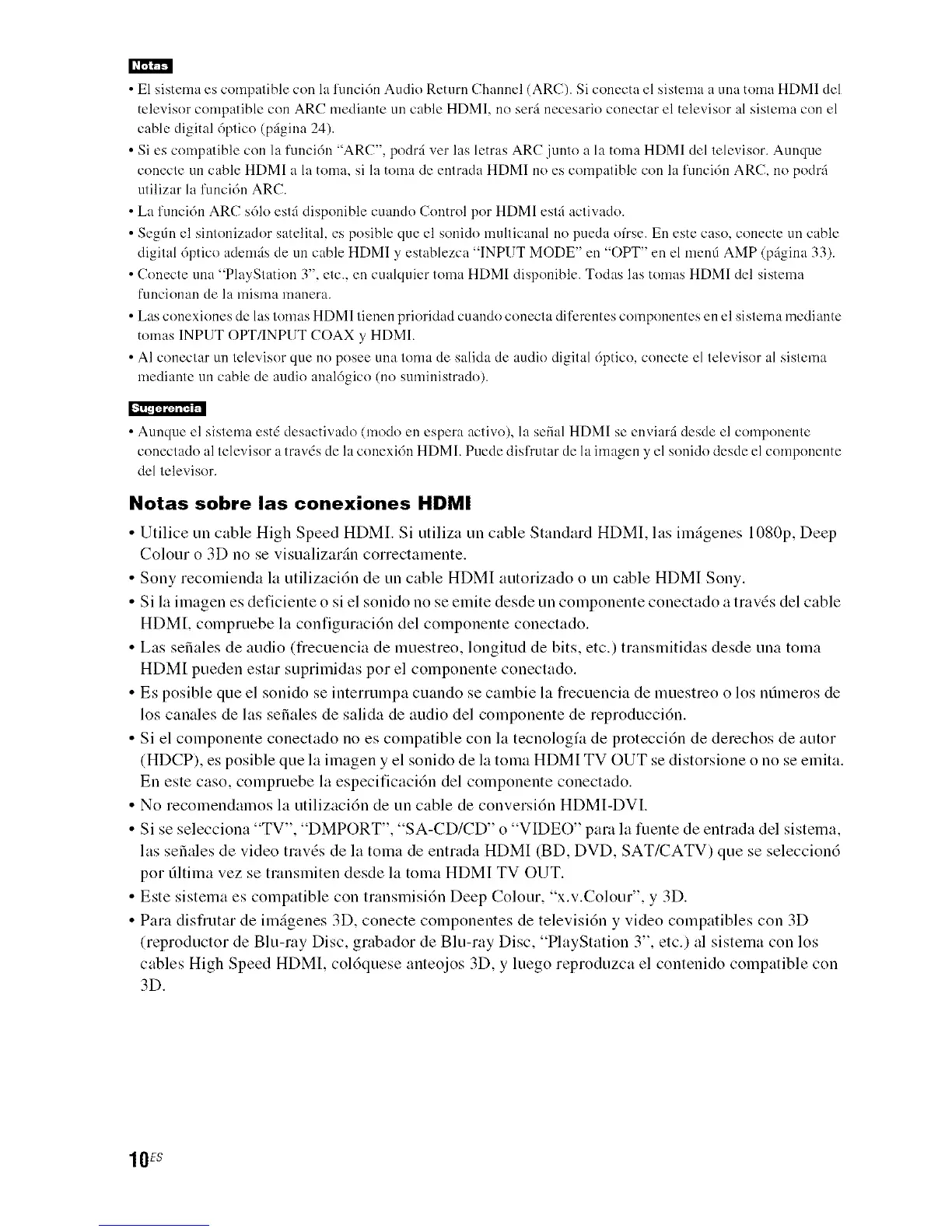 • Sony recomienda llt utilizaci6n de un cable HDMI autorizado o un cable HDMI Sony.
