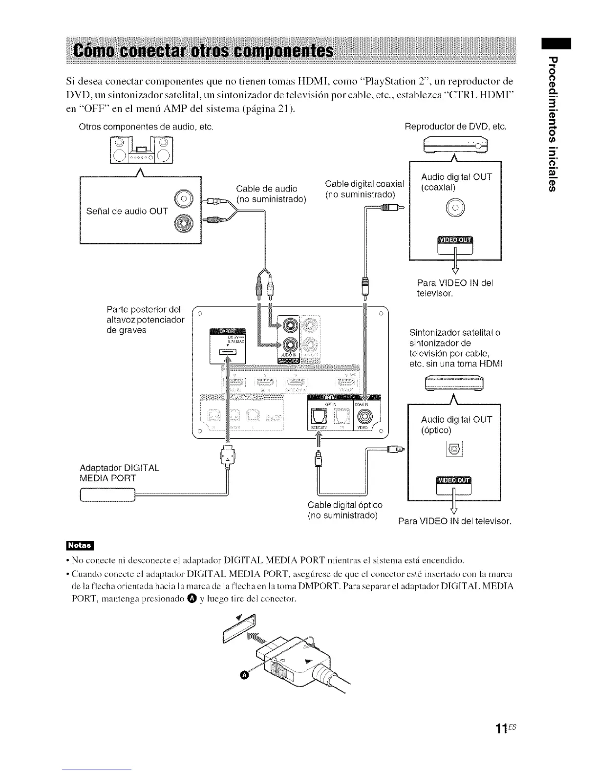 • No conecte ni desconecte el adaptador DIGITAL MEDIA PORT mientras el sistema est:i encendido.