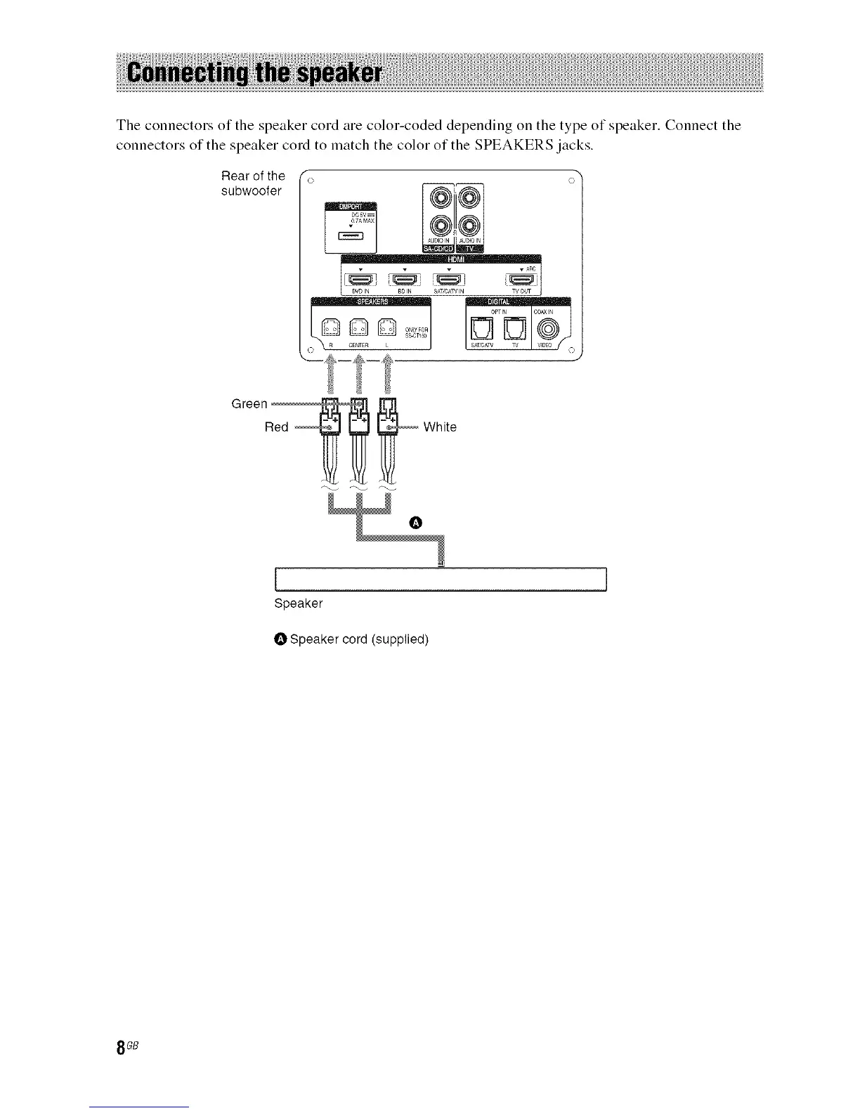 The connectors of the speaker cord are color-coded depending on the type of speaker. Connect the