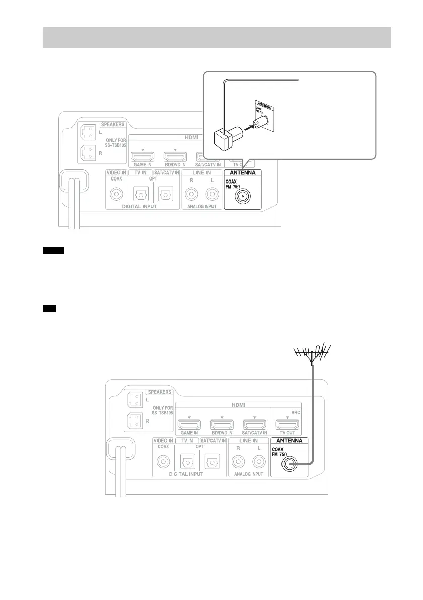 • If you have poor FM reception, use a 75-ohm coaxial cable (not supplied) to connect the subwoofer to an outdoor