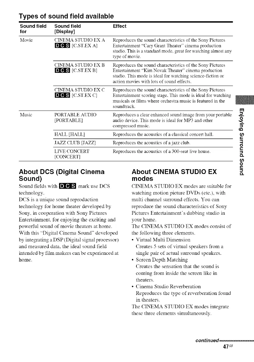 CINEMA STUDIO EX B Reproduces the sound characteristics of the Sony Pictures