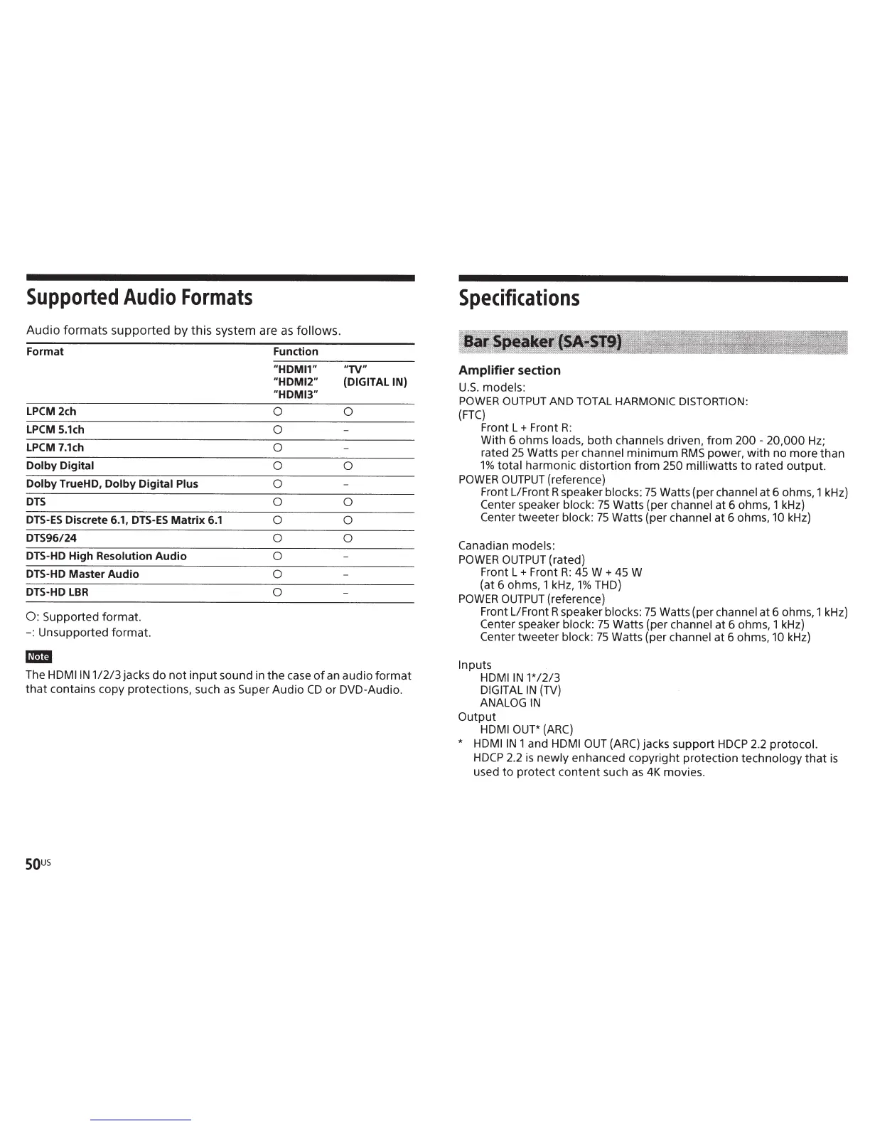 Sony HT-ST9 - Supported Audio Formats; Specifications; Amplifier and Input;Output Specifications