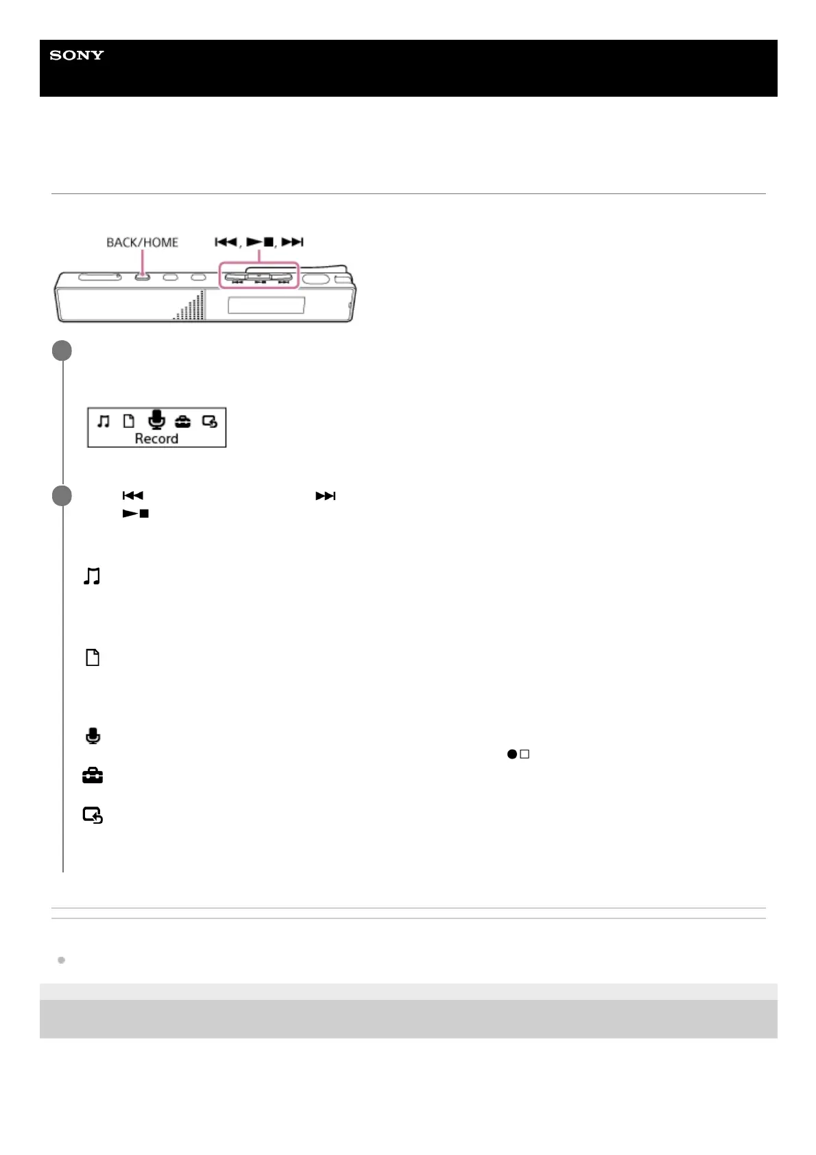 The HOME menu allows you to select a function, search for recorded files, or change the settings on your IC recorder.