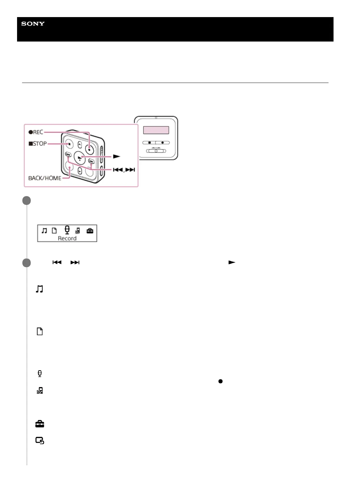 The HOME menu allows you to select a function, search for recorded files, or change the settings on the IC recorder.