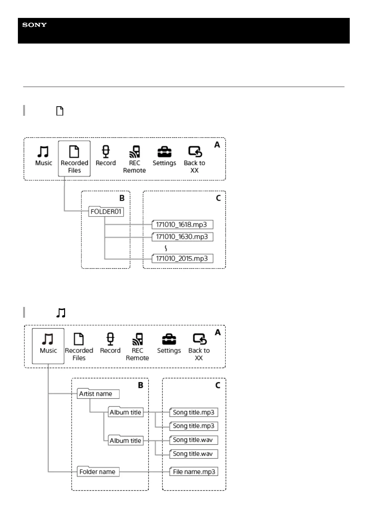 The following illustrates the structure of folders and files that you can view on your IC recorder.