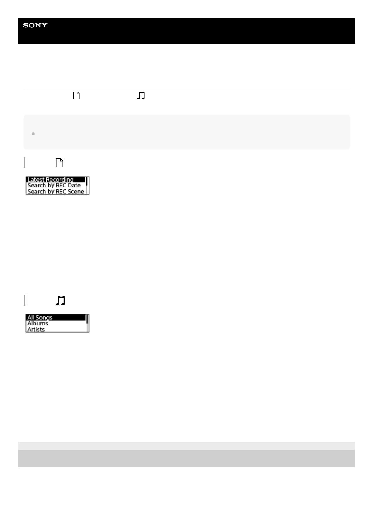 Recorded Files” or “ Music” on the HOME menu, the search categories of the stored files