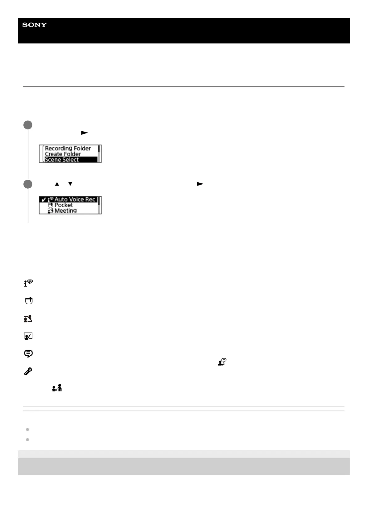 the sensitivity level of the built-in microphones, at once by selecting one of the recording scenes (Scene Select).