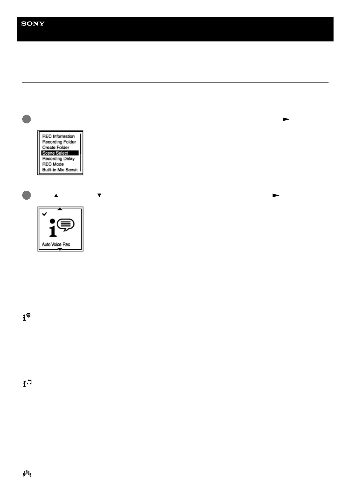 the sensitivity level of the built-in microphones, at once by selecting one of the recording scenes (Scene Select).