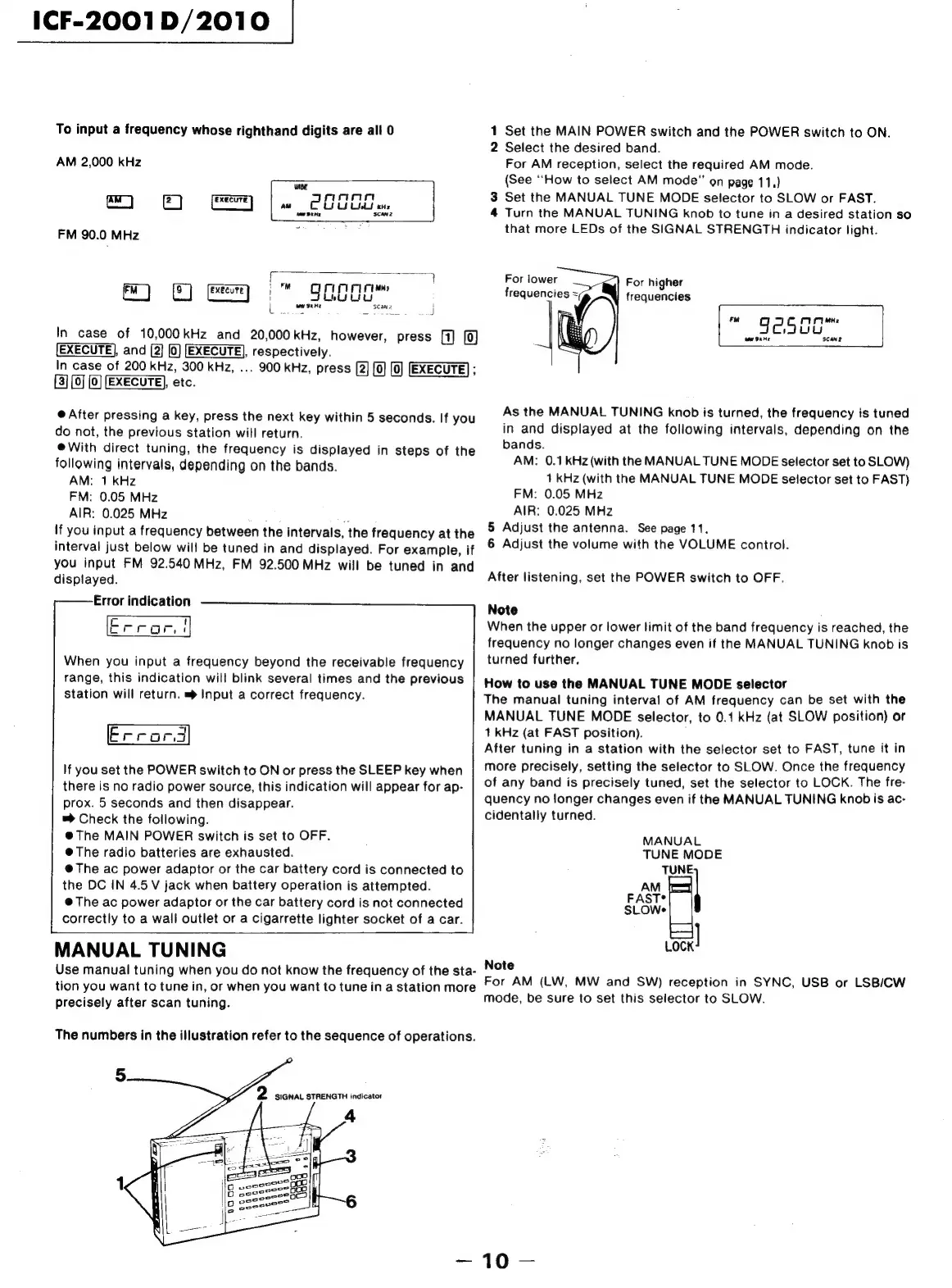 Sony ICF-2001D - Tuning Operation Details; Direct Frequency Input Methods; Manual Tuning Procedures