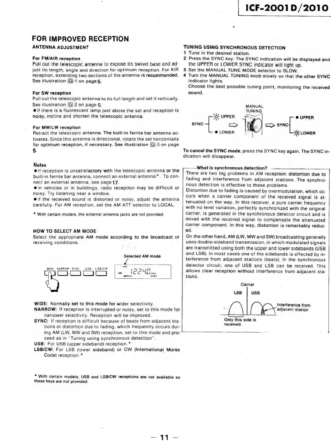 Sony ICF-2001D - Improving Reception and AM Modes; Antenna Adjustment Techniques; AM Mode Selection; Synchronous Detection Tuning
