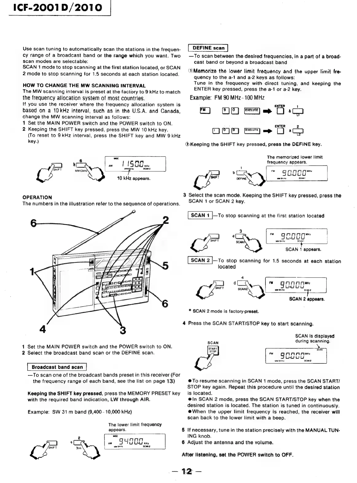Sony ICF-2001D - Scan Tuning Operations; Scan Tuning Basics and Memory Check; MW Scanning Interval Change; Define and Broadcast Band Scan Modes