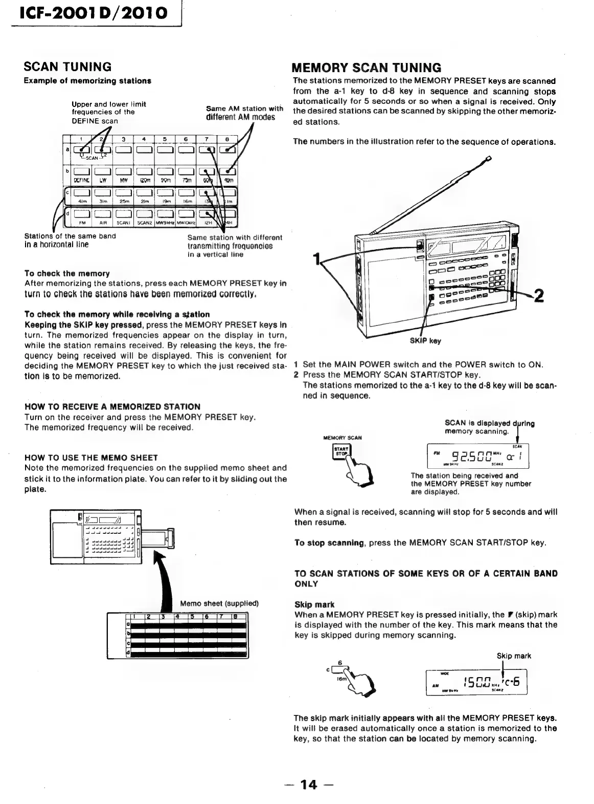 Sony ICF-2001D - Memory Scan Tuning; Memory Scan Operation; Skipping Stations and Bands