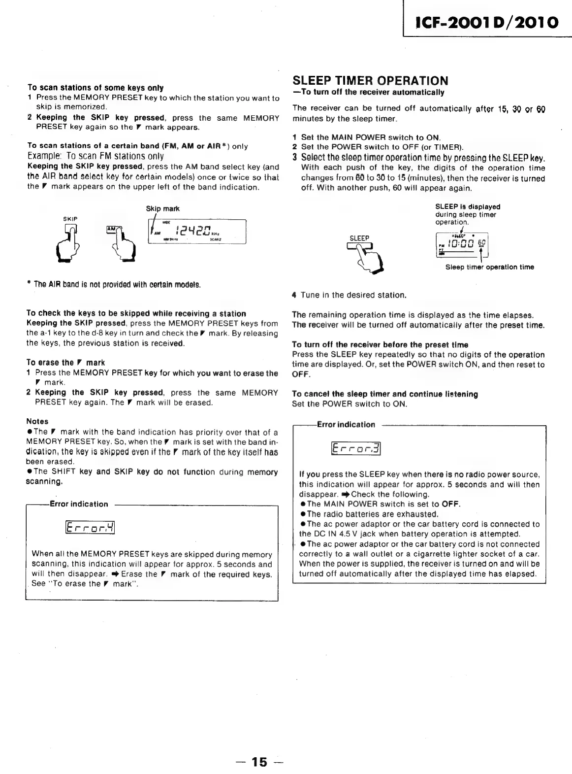 Sony ICF-2001D - Sleep Timer Operation; Sleep Timer Setup and Usage; Sleep Timer Error Indications