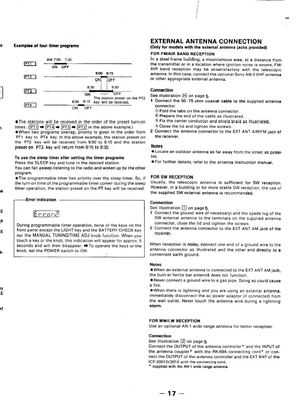 Sony ICF-2001D - External Antenna Connections; FM;AIR Band Antenna Connection; SW and MW;LW Antenna Connection