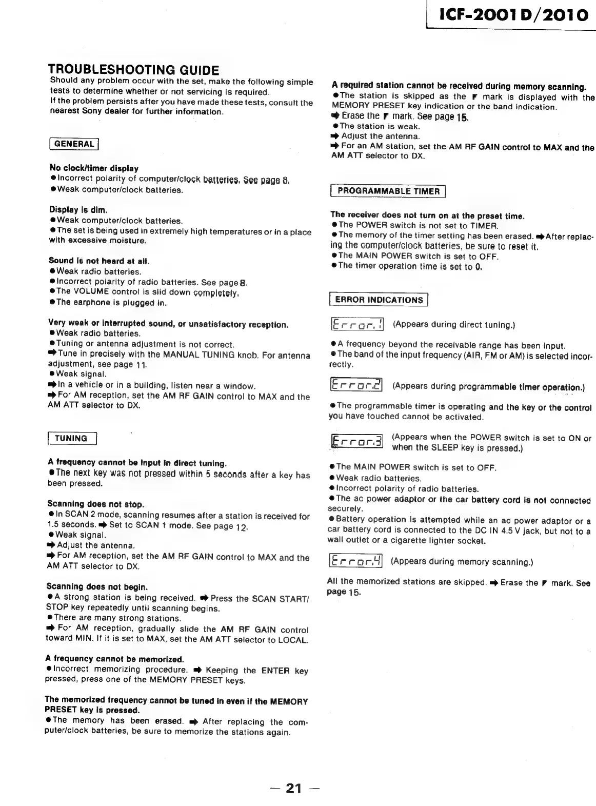 Sony ICF-2001D - Troubleshooting Guide; General Problems and Solutions; Tuning and Memory Troubleshooting; Timer and Error Indication Troubleshooting