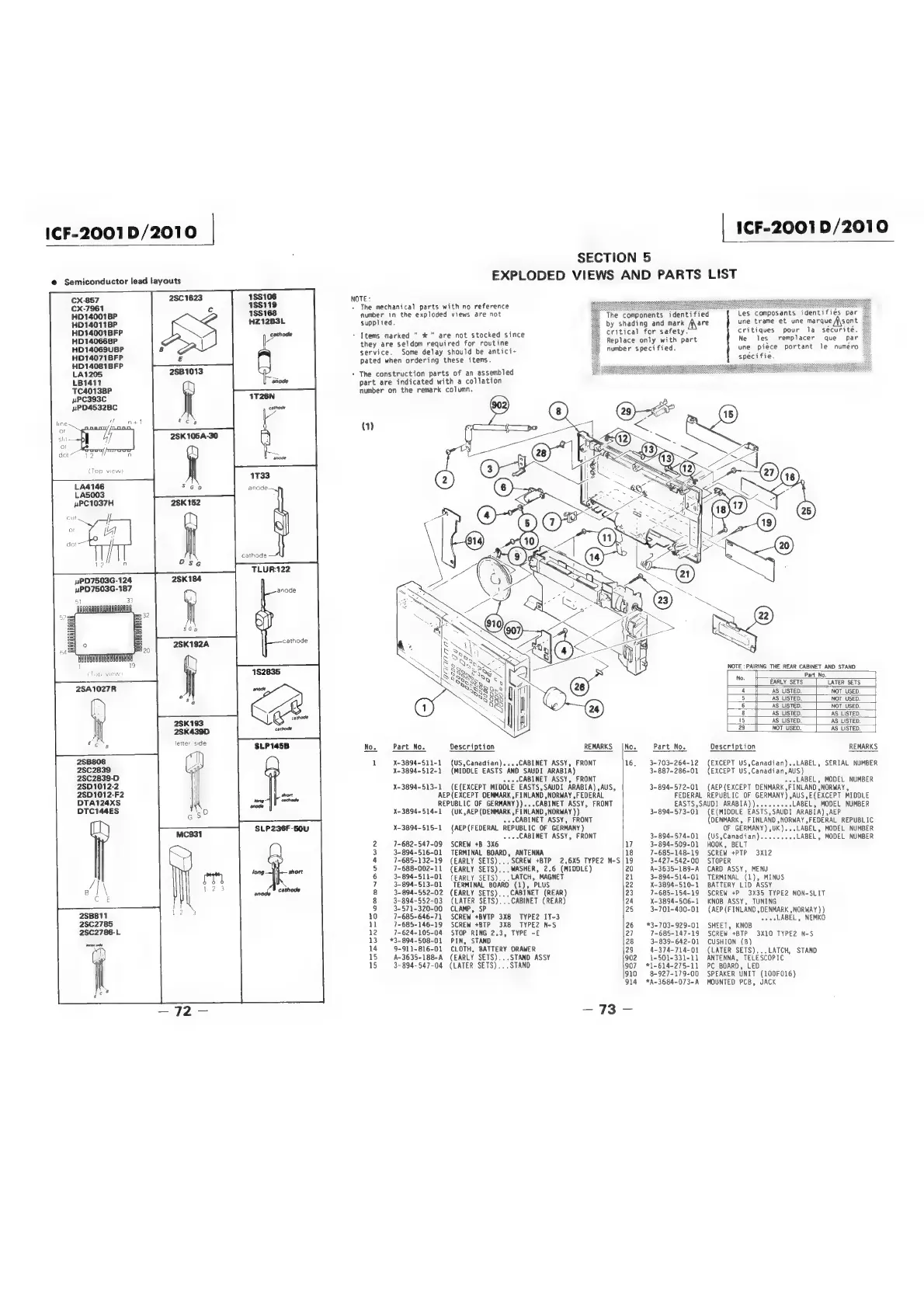 Sony ICF-2001D - Exploded Views and Parts List; Semiconductor Lead Layouts; Critical Safety Component Identification