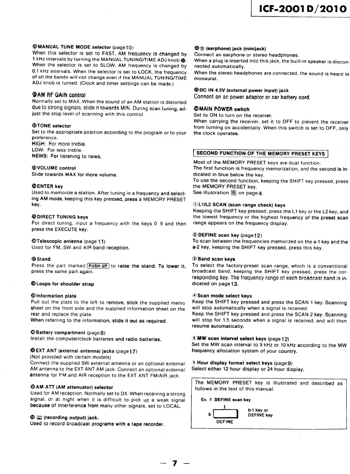 Sony ICF-2001D - Additional Controls and Second Functions; Tuning Mode and Input Controls; Physical Features and Power Jacks; Memory Preset Second Functions