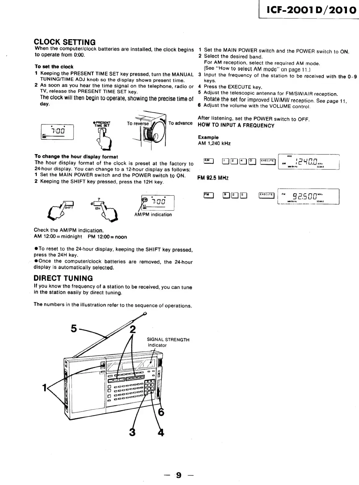 Sony ICF-2001D - Clock and Direct Tuning Operations; Clock Setting Procedures; Direct Tuning Operation
