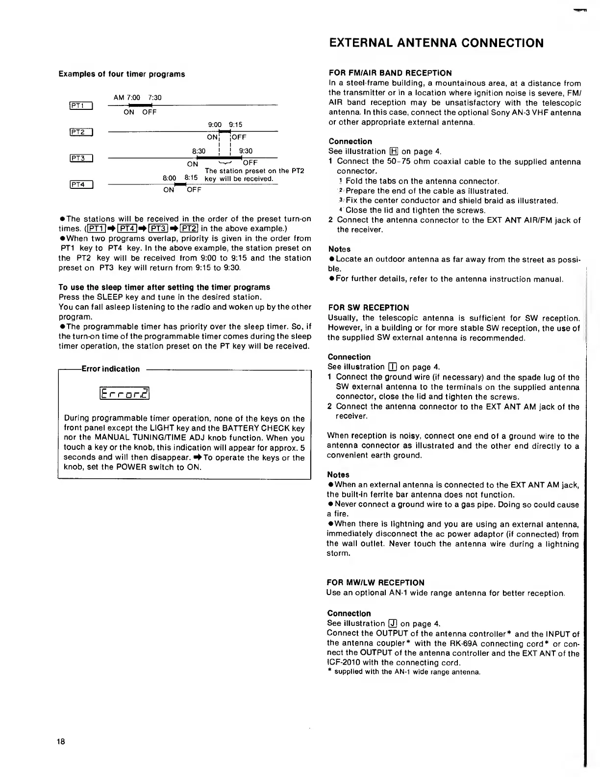 Sony icf 2010 - External Antenna Connection; FM;AIR Band Reception; SW Reception; MW;LW Reception