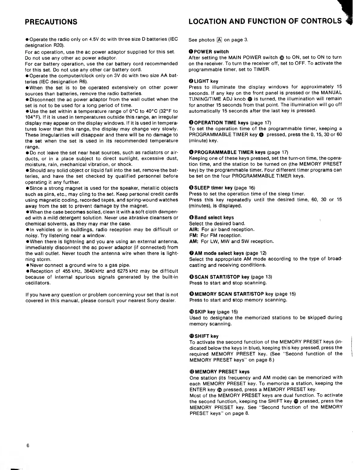 Sony icf 2010 - Precautions; Location and Function of Controls