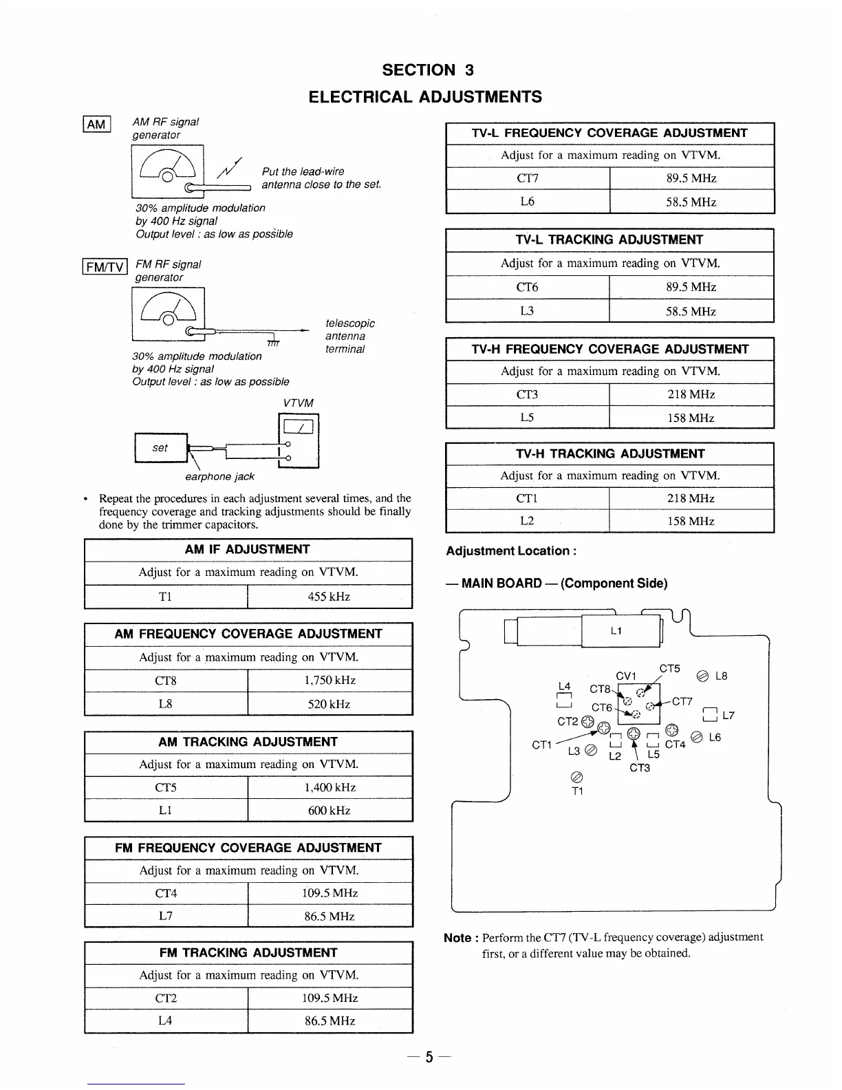 Sony ICF-34 - Electrical Adjustment Procedures; AM Band Electrical Adjustments; FM Band Electrical Adjustments; TV Band Electrical Adjustments
