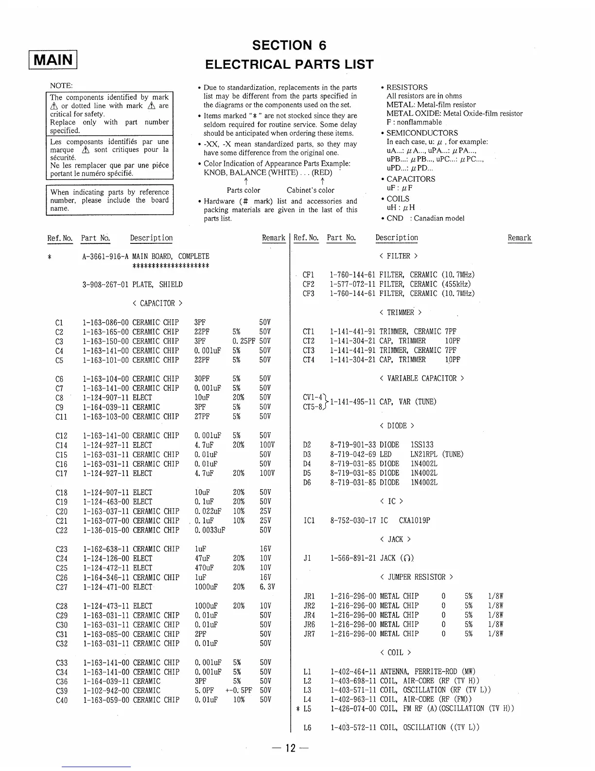 Sony ICF-34 - Electrical Parts List; Filters, Coils, and Components; Capacitors and Trimmers; Semiconductors, Jacks, and Resistors