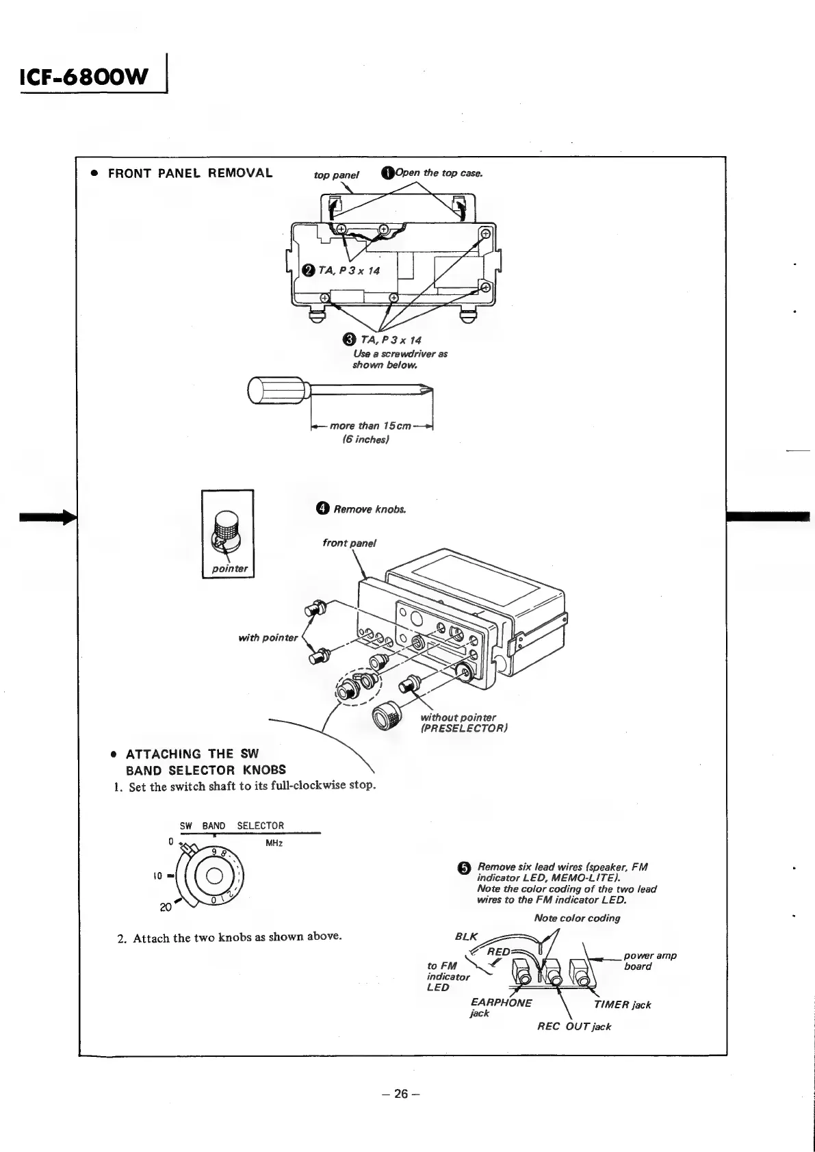 Sony ICF-6800W - Front Panel Removal; Attaching SW Band Selector Knobs