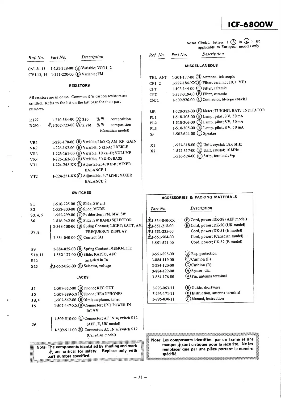 Sony ICF-6800W - Resistors, Switches, and Jacks; Miscellaneous and Accessories