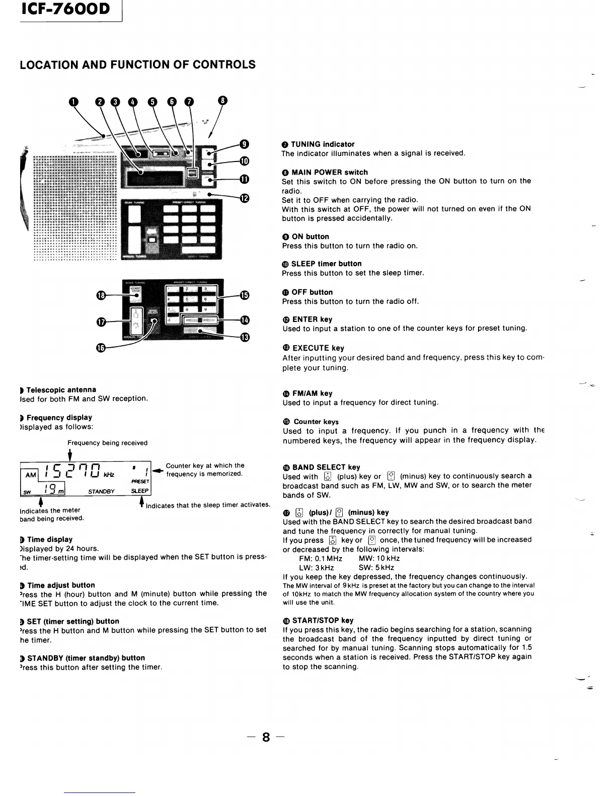 Sony ICF-7600D - Location and Function of Controls; Control Panel Overview and Functions