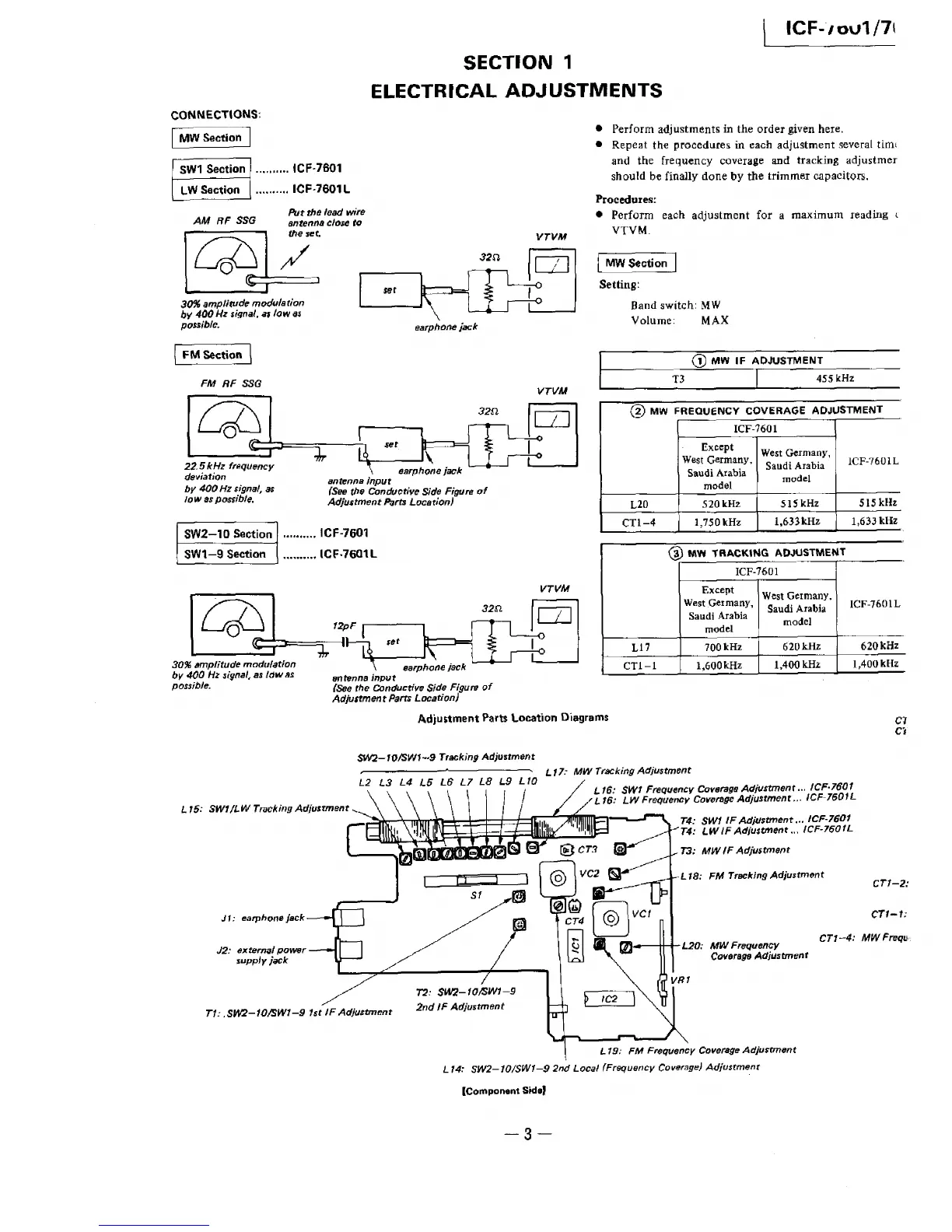Sony ICF-7601 - Electrical Adjustments; MW Band Electrical Adjustments; FM Band Electrical Adjustments; SW Band Electrical Adjustments