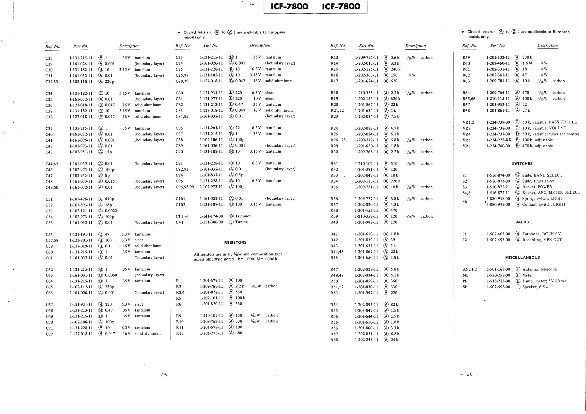 Sony ICF-7800 - SECTION 6 ELECTRICAL PARTS LIST (Continued); Resistors, Switches, and Jacks List