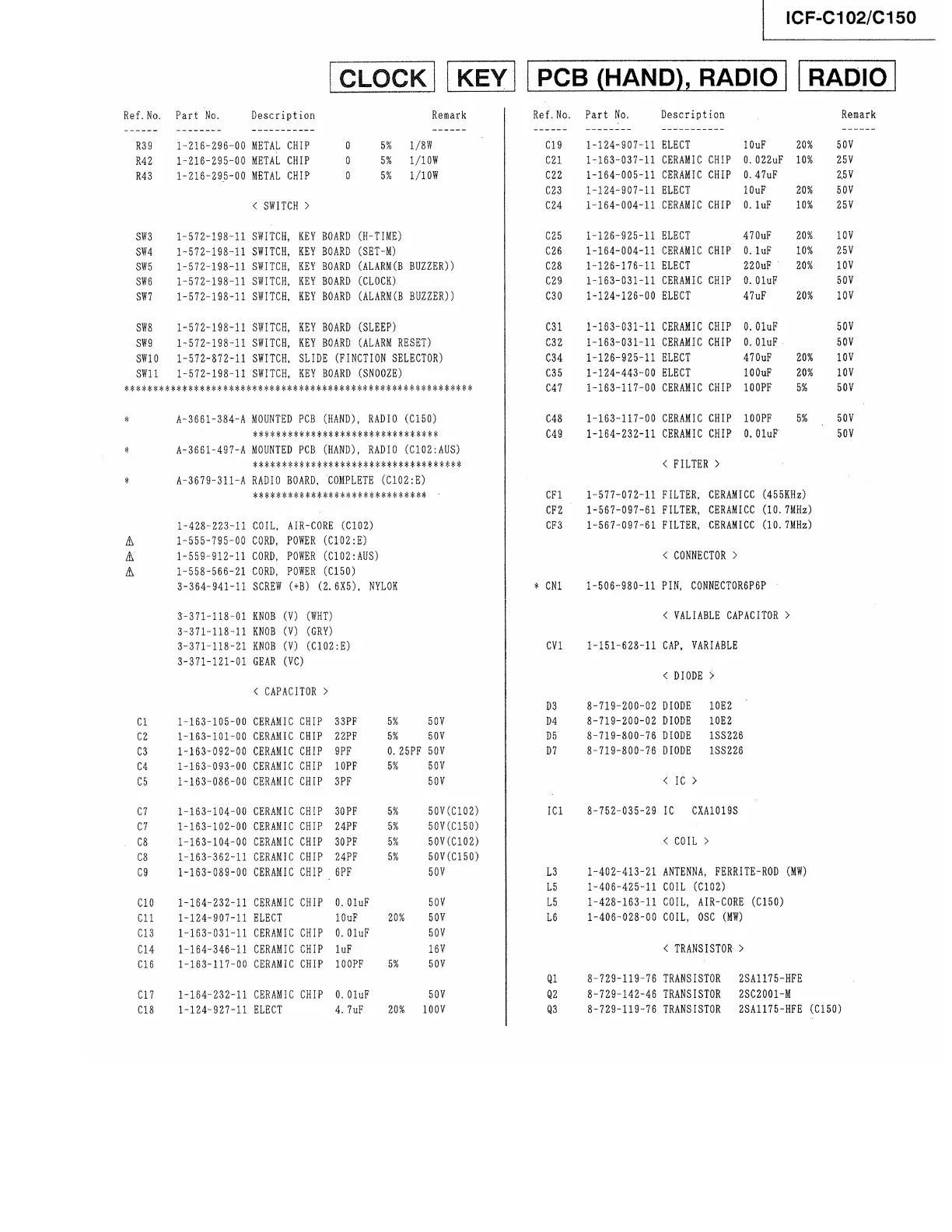 Sony ICF-C102 - Switches, Connectors & Terminals; IC, Coil & Transistor Components; Filter & Transformer Components