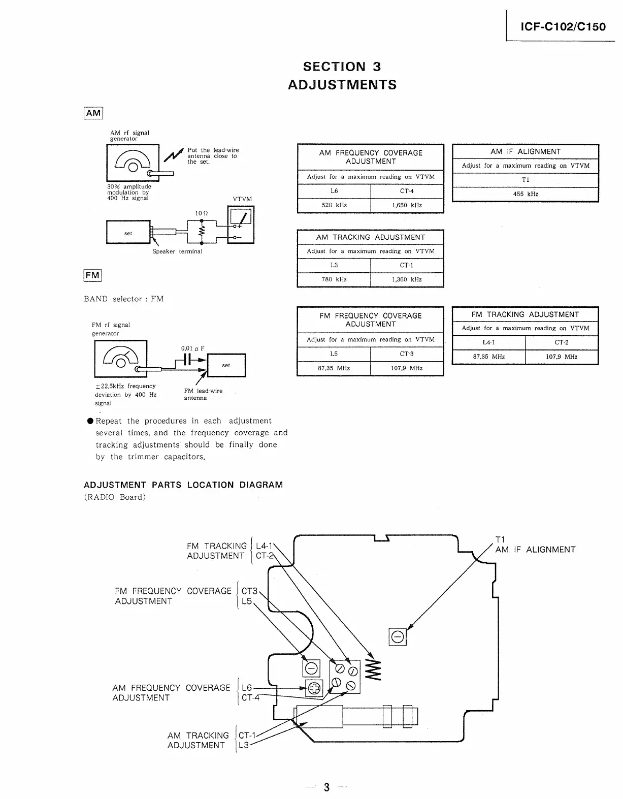 Sony ICF-C150 - Technical Adjustments; AM Adjustments; FM Adjustments; Adjustment Parts Location