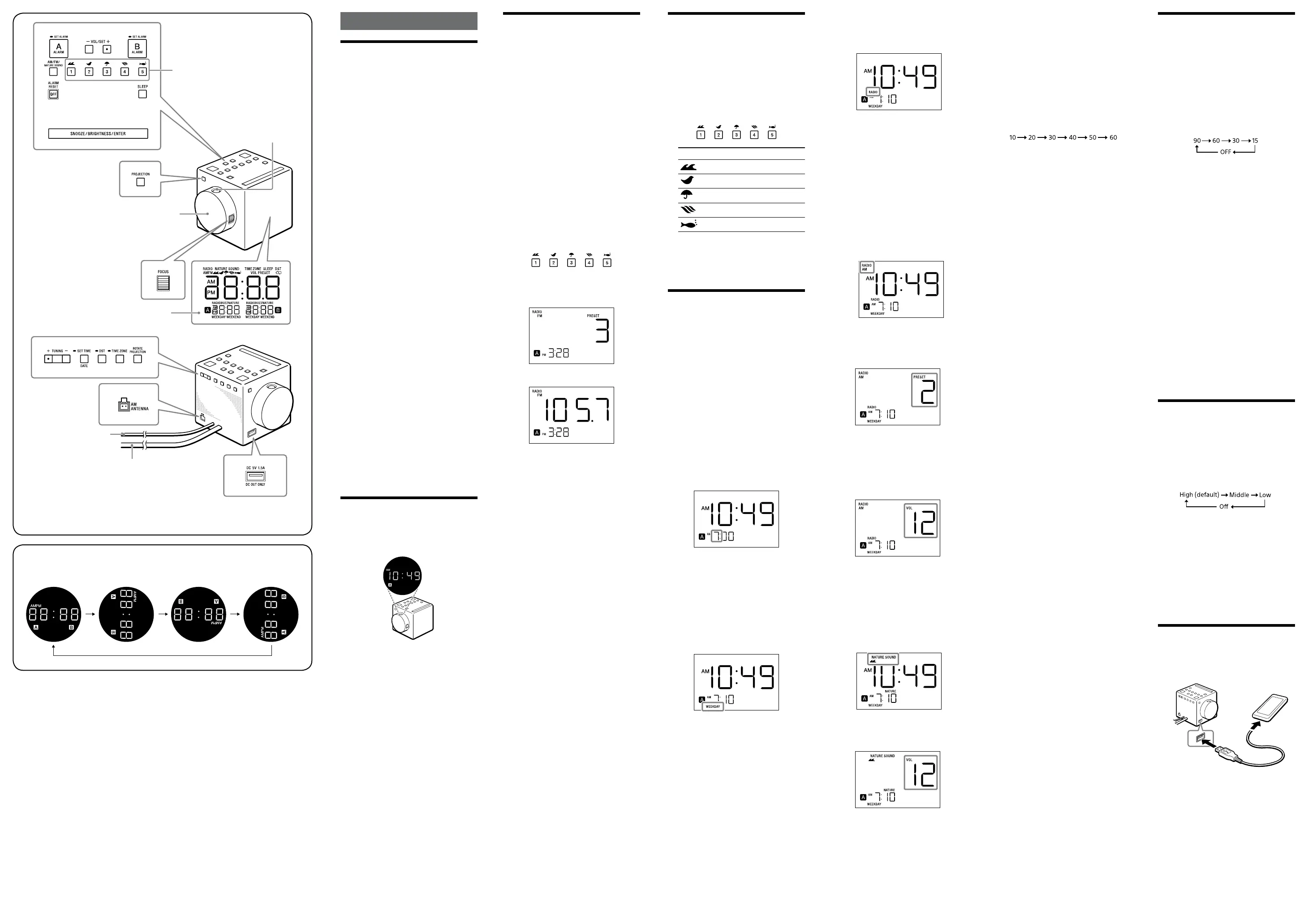 (NATURE SOUND/PRESET) and ALARM RESET/OFF as a guide when operating the