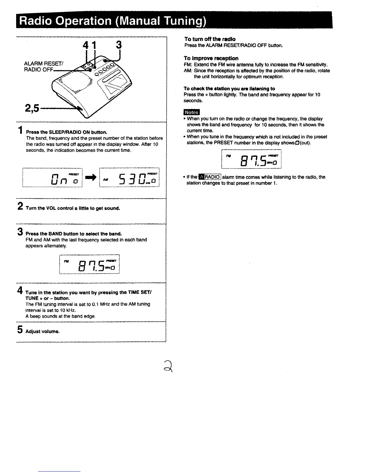 Sony ICF-C203 - Radio Operation (Manual Tuning); To Turn off the Radio; To Improve Reception; To Check the Station You Are Listening to