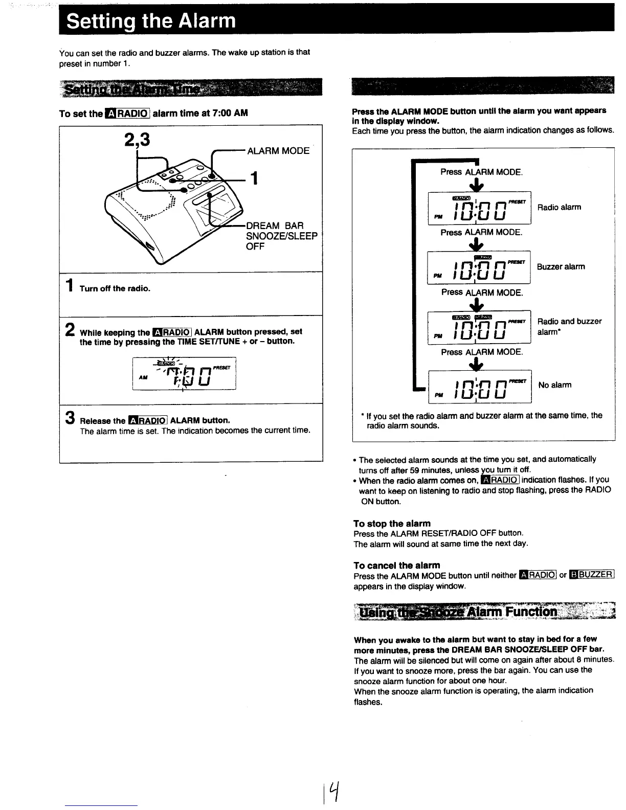 Sony ICF-C203 - Setting the Alarm; Set Radio Alarm; Stop Alarm; Cancel Alarm