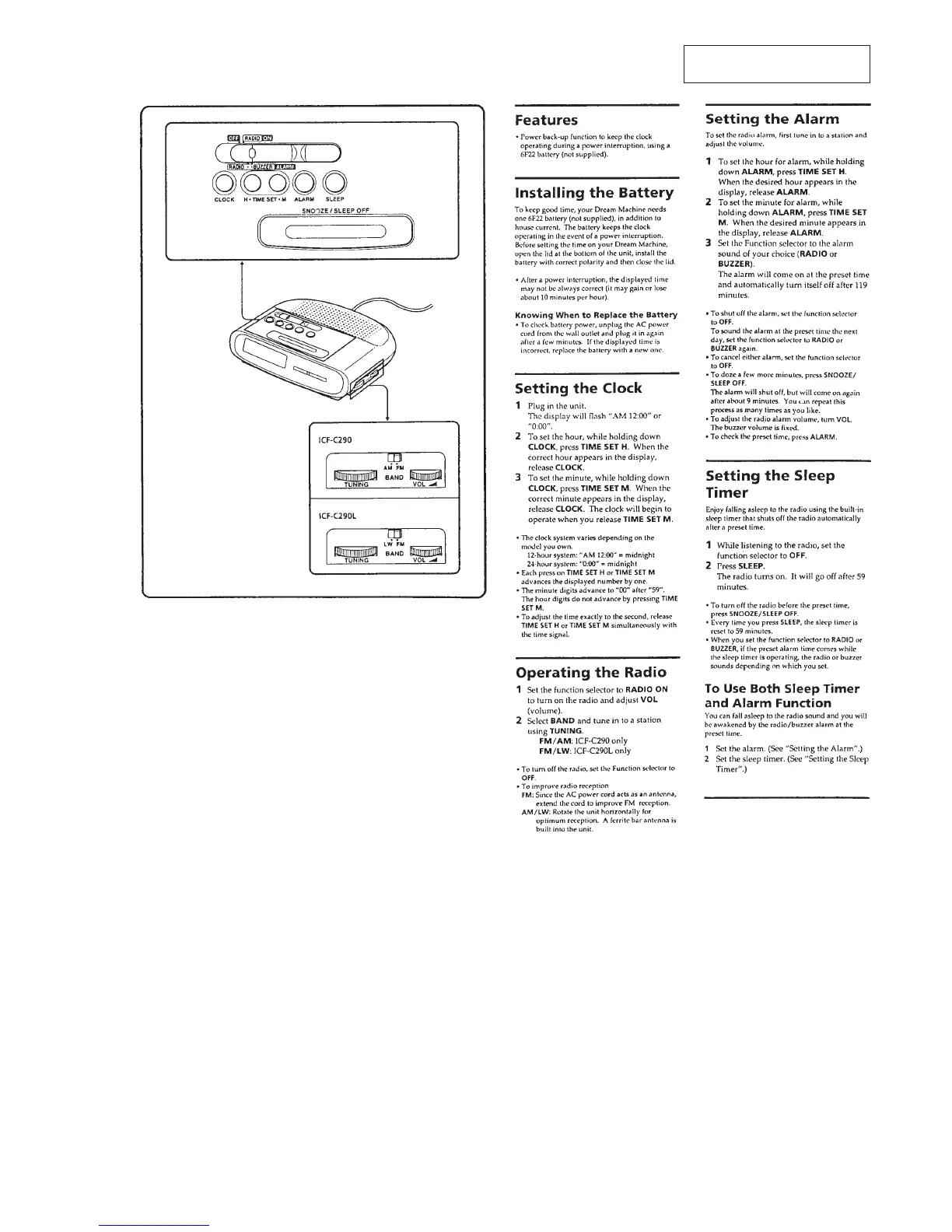 Sony ICF-C290 - General Information and Basic Operations; Product Features and Battery Installation; Setting the Clock and Operating the Radio; Alarm and Sleep Timer Functions