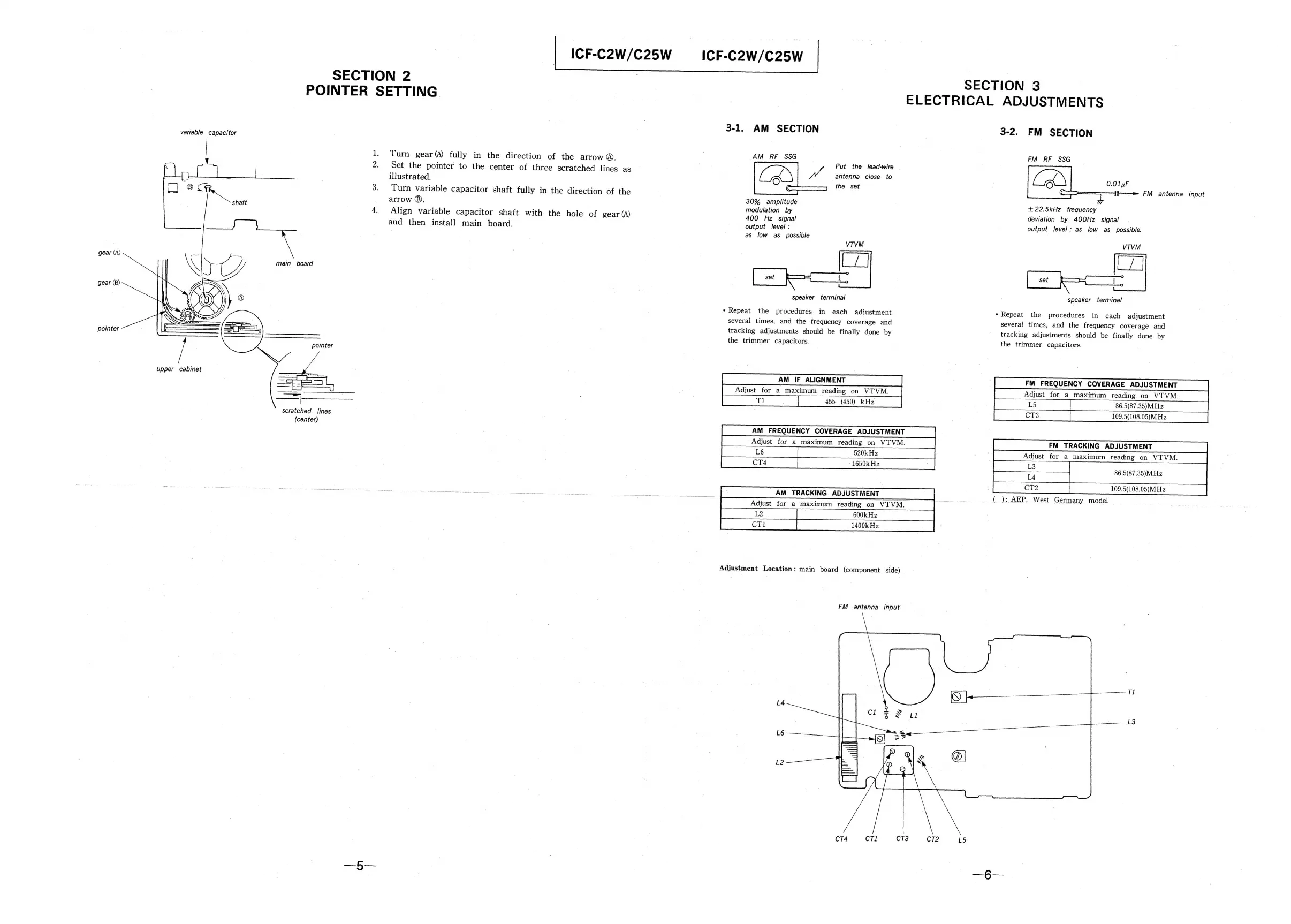 Sony ICF-C2W - Section 2 Pointer Setting; Section 3 Electrical Adjustments; AM Section Adjustments; FM Section Adjustments