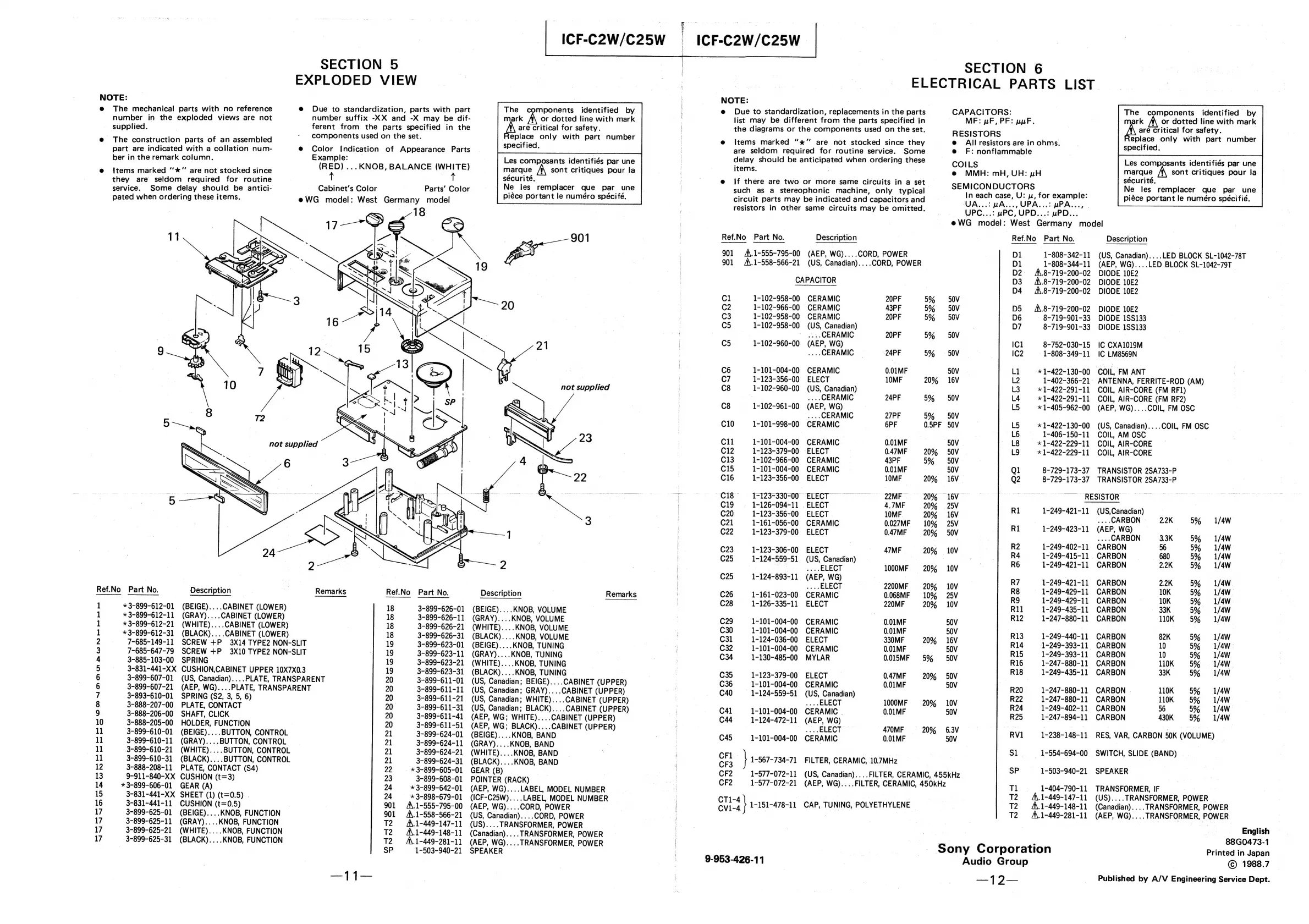 Sony ICF-C2W - Section 5 Exploded View; Section 6 Electrical Parts List