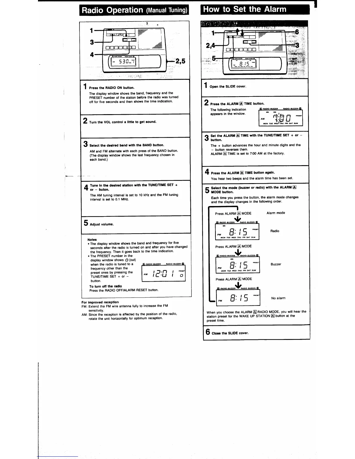 Sony ICF-C303 - Radio Operation; Manual Tuning; How to Set the Alarm; Setting Alarm A