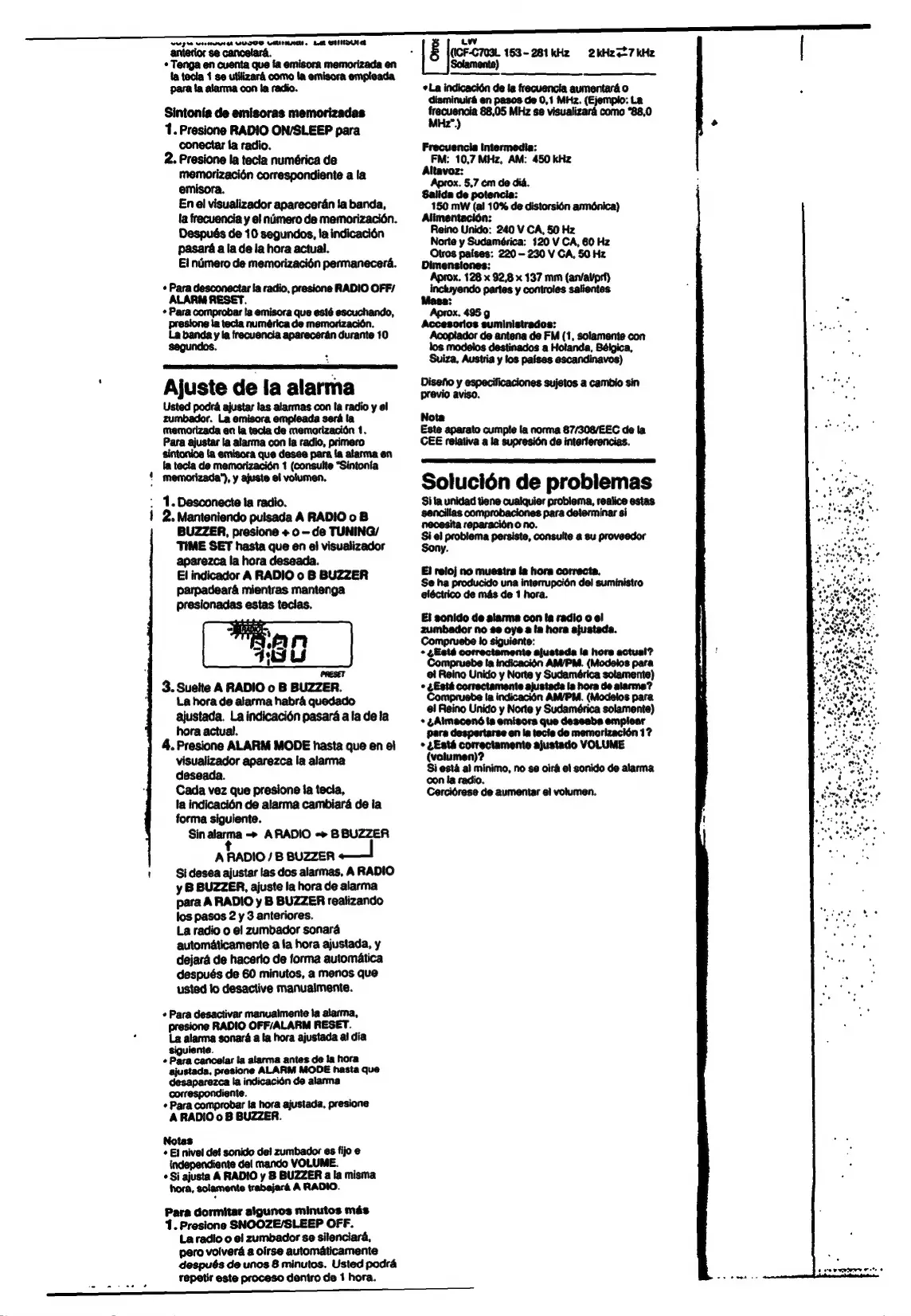Sony ICF-C703 - Ajuste de la Alarma; Solución de Problemas