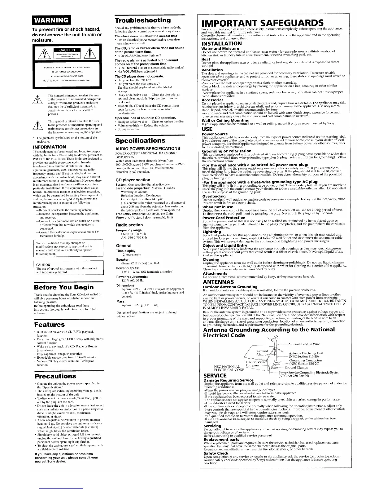 Sony ICF-CD831 - Important Safeguards; Installation and Use Precautions; Cleaning and Antenna Safety; Troubleshooting