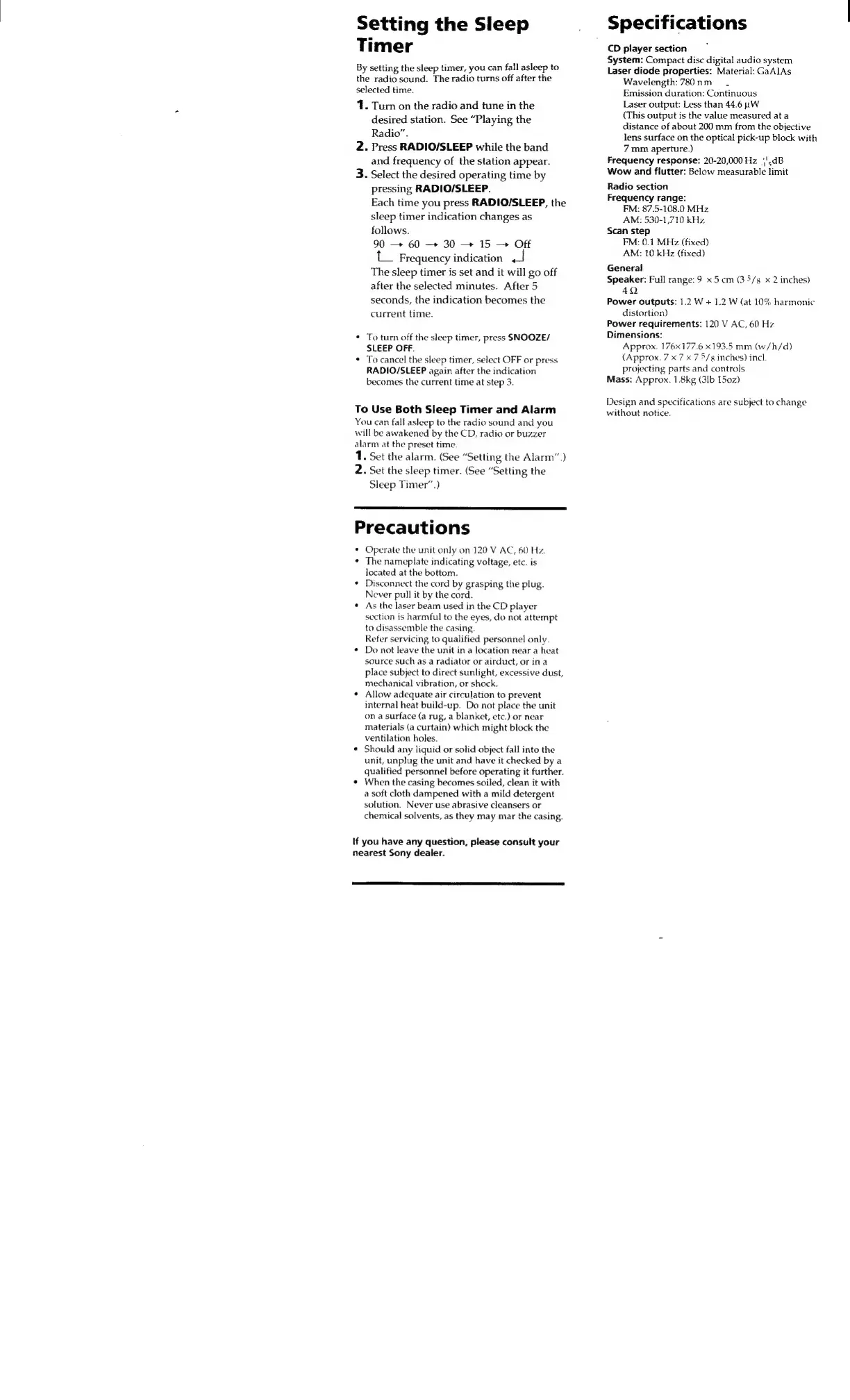 Sony ICF-CD833 - Setting the Sleep Timer; General Precautions