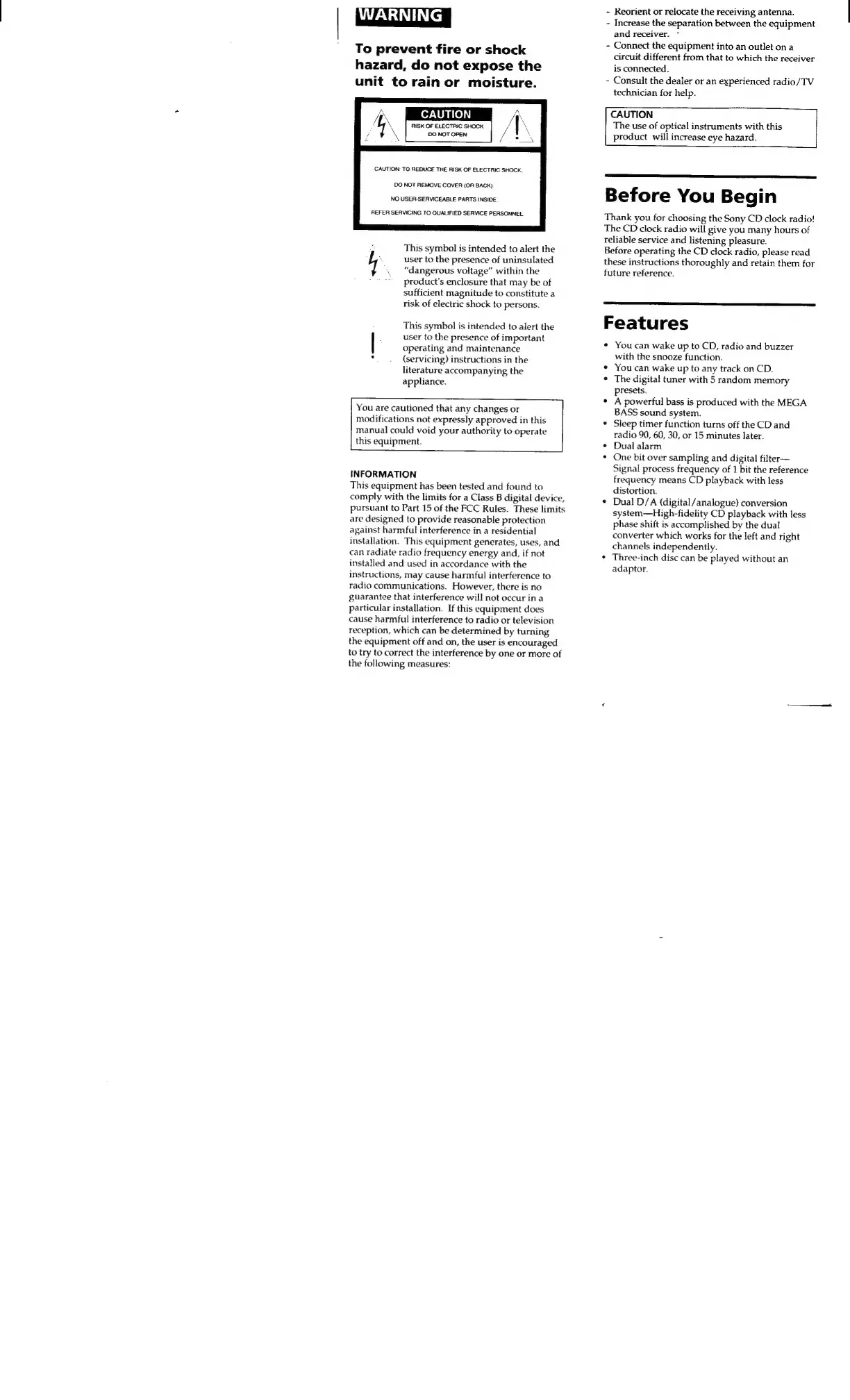 Sony ICF-CD833 - Important Safety Information; General Safety Precautions; Electrical Safety; Product Features and Setup