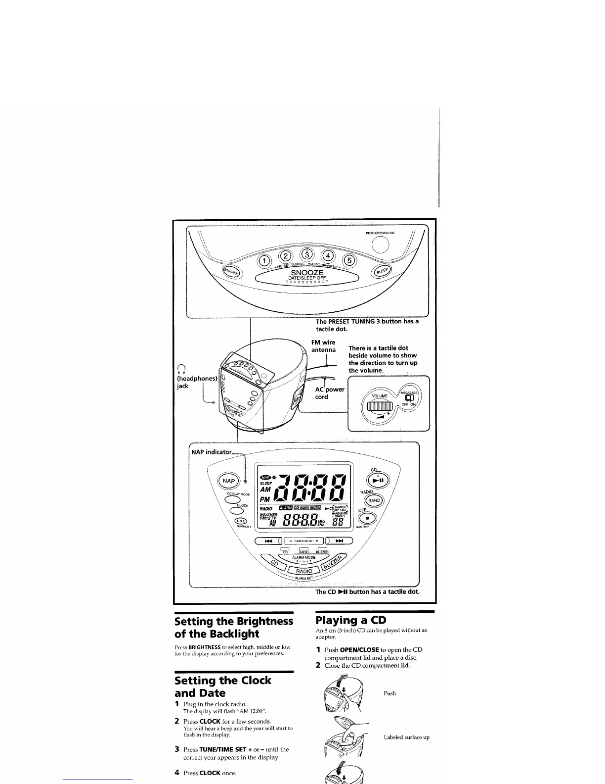 Sony ICF-CD853V - Setting the Brightness of the Backlight; Setting the Clock; Playing a CD