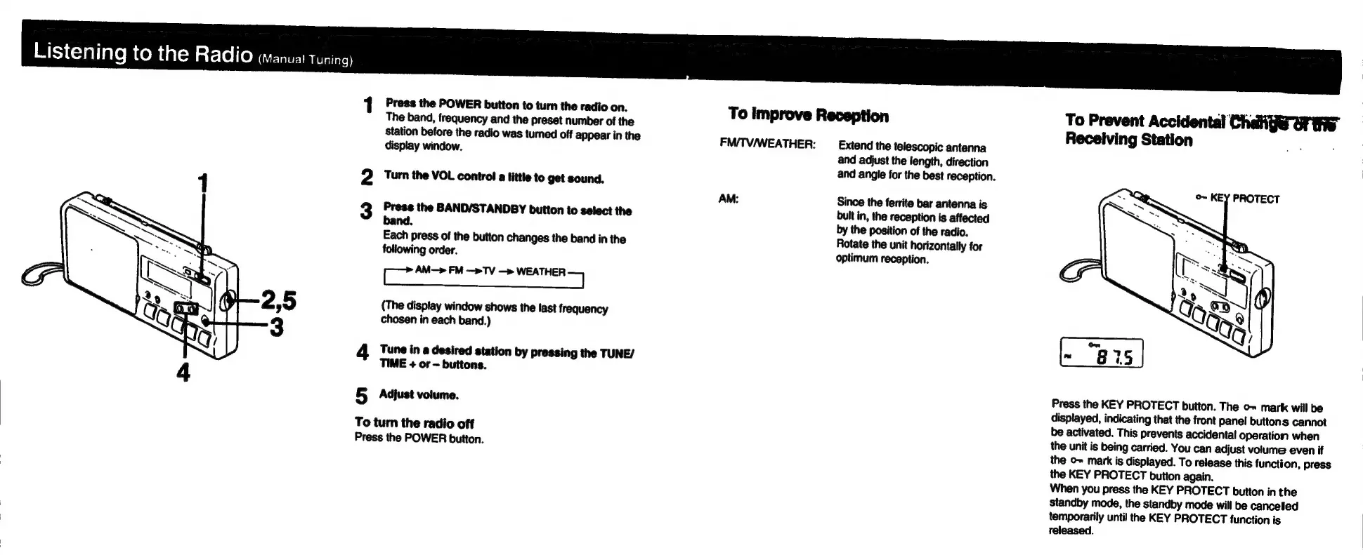 Sony ICF-M350V - Listening to the Radio; Manual Tuning; Improving Reception; Key Protect Function