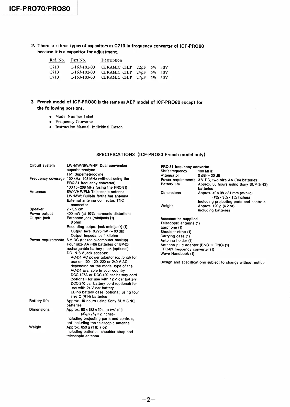 Sony ICF-PRO70 - C713 Capacitor Types and Values; ICF-PRO80 French Model Specifications